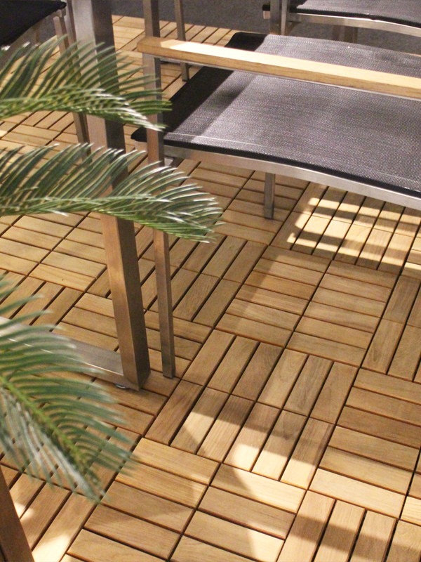 THE DECKING TILES ARE COMPLETED WITH A REVOLUTIONARY PLASTIC LOCKING SYSTEM FITTED TO THE UNDERSIDE, ALLOWING THEM TO SIMPLY CLIP TOGETHER WITHOUT THE NEED OF NAILS. THIS SIMPLE INSTALLATION WILL BRING THE WARMTH OF WOOD AND DELIGHTFUL ATMOSPHERE INTO YOUR OWN BALCONY